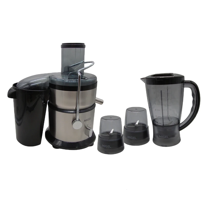 آب میوه گیری میگل مدل GPJ 182 یک وسیله پرکاربرد خانگی است که با ظاهری زیبا و بدنه استیل در اختیار کاربران قرار گرفته. این دستگاه به صورت چند منظوره ارائه شده که با نصب هر کدام از قطعات بر روی موتور، به راحتی می توان از کارایی های مختلف آنها بهره برد. این مدل دارای موتوری با توان 800 وات است و این امکان را می دهد تا در صورت نیاز سرعت را در 2 حالت تنظیم کرد. این آبمیوه گیری چهار کاره با برخورداری از دهانه 75 میلیمتری، ورود میوه ها را به طور کامل آسانتر کرده است. فیلتر و تیغه استیل بادوام در آب میوه گیری میگل مدل GPJ 182 موجب آبگیری بهتر میوه ها می شود و به دلیل بهره گیری از مخزن تفاله مجزا و جمع آوری پالپ در آن، نوشیدنی ها صاف و گوارا خواهند بود. همچنین میگل، دهانه خروجی آب میوه گیری میگل مدل GPJ 182 را به صورت شیب دار و منطبق با مخزن آبمیوه گیری طراحی کرده تا از چکه کردن آب میوه به اطراف جلوگیری نماید. به همراه آب میوه گیری میگل مدل GPJ 182 پارچ شیشه ای 1.5 لیتری عرضه شده که به کمک آن می توان انواع مواد سرد و گرم را بدون نگرانی از شکستن، میکس نمود. پایه های ضد لغزش در زیر 182 میگل باعث شده تا دستگاه هنگام کار کردن در جای خود ثابت بماند و تکانی نخورد.