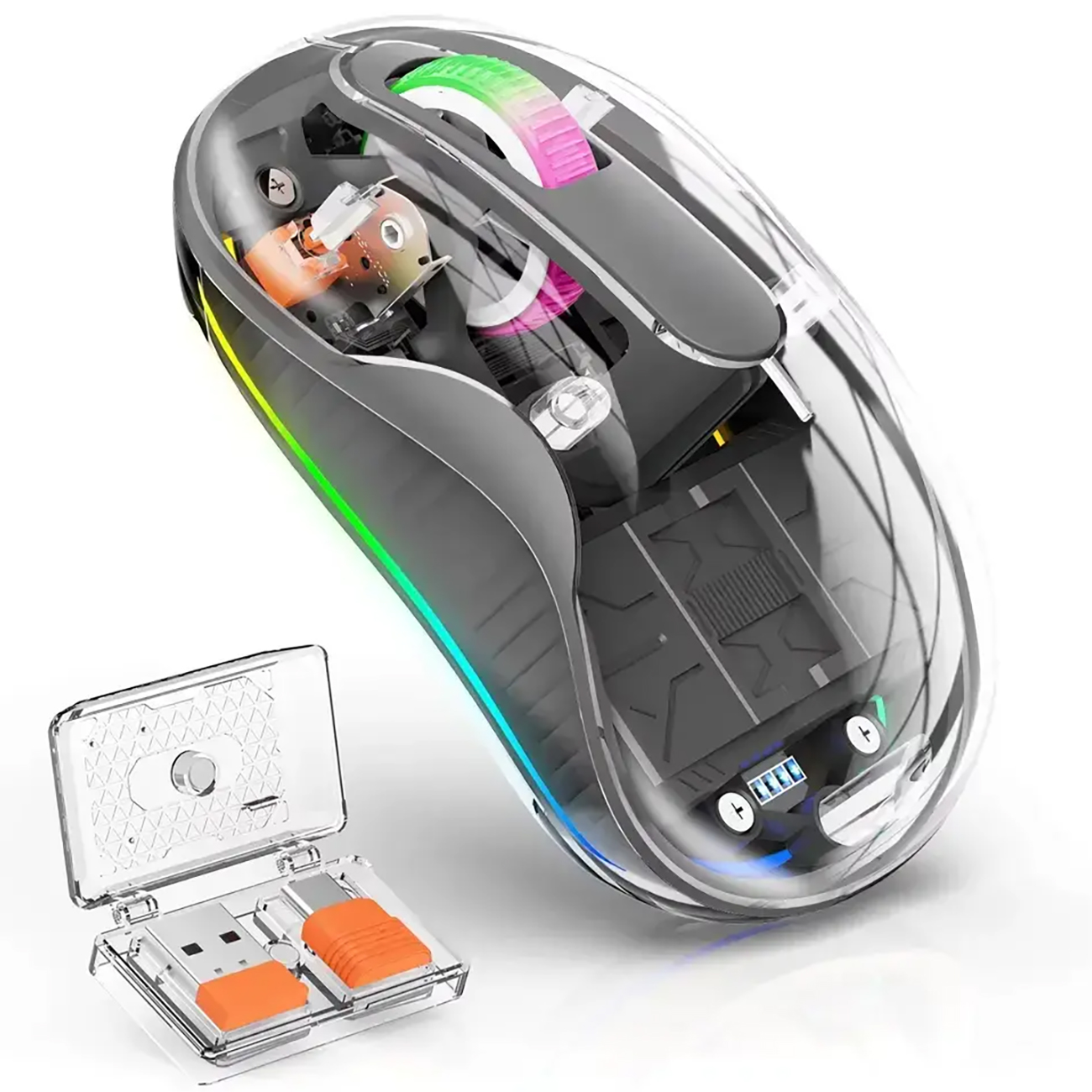 سایر توضیحات تعداد دکمه‌ها ۵ عدد / بدنه شفاف با نورپردازی RGB، کلیک بی‌صدا، باتری داخلی ۴۰۰ میلی‌آمپر ساعتی، دو گیرنده USB-A و Type-C -