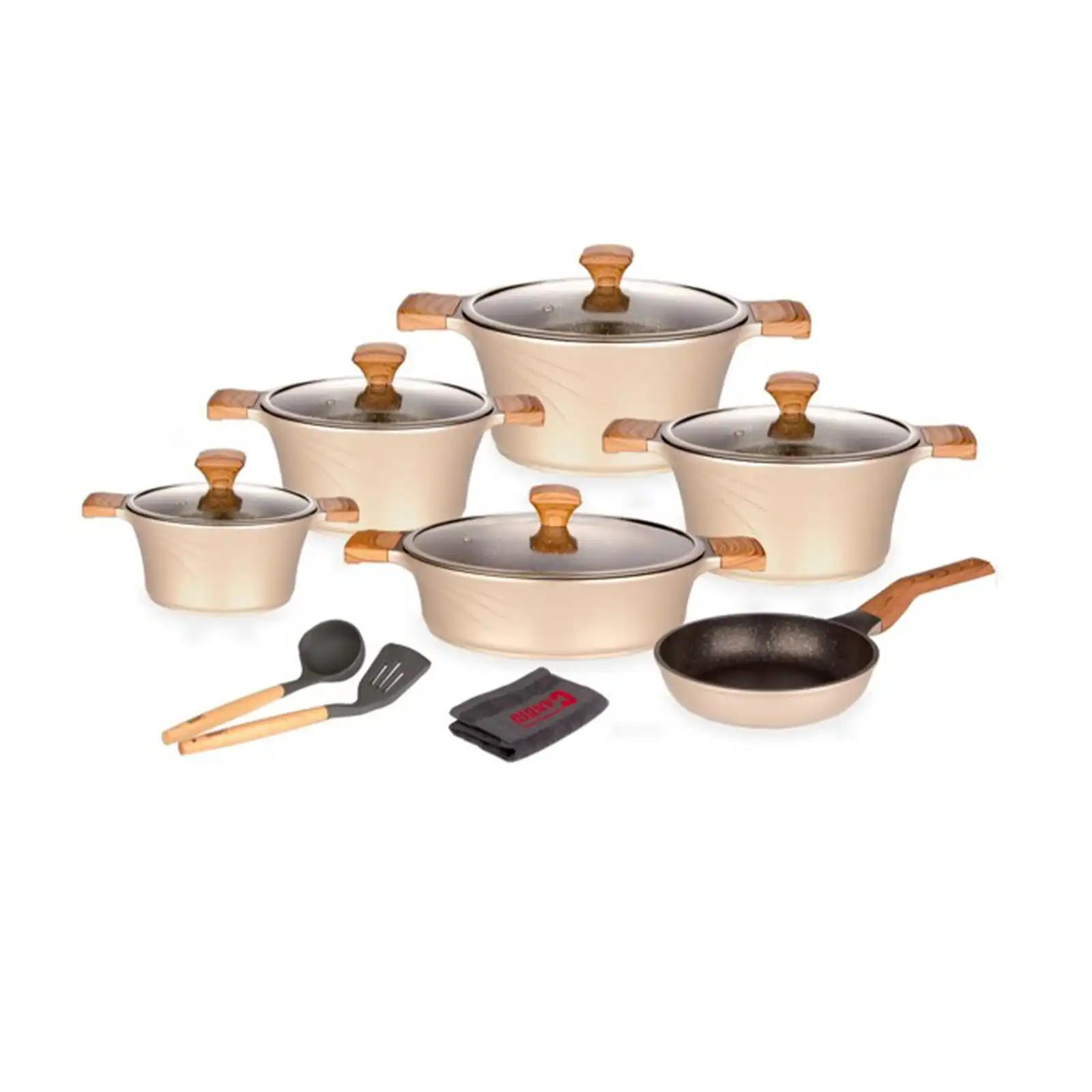 - تعداد پارچه: این سرویس شامل 14 پارچه است که شامل قابلمههای در سایزهای مختلف، تابه، کفگیر و ملاقه میشود.